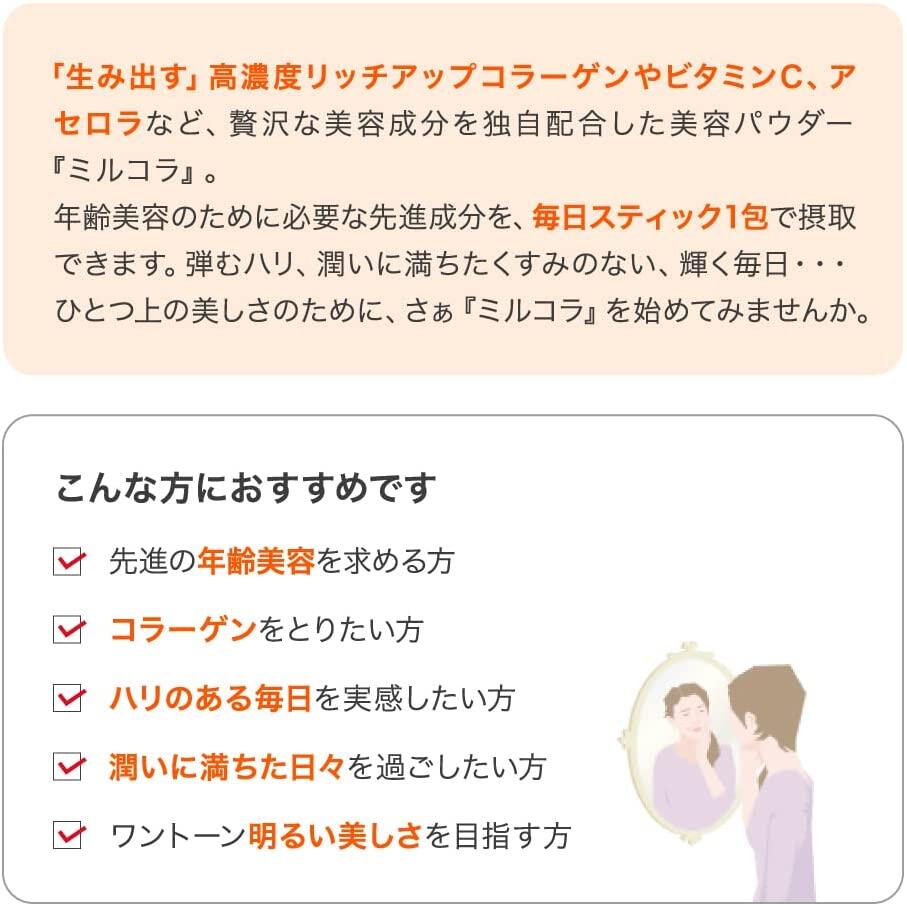 1. Are seeking to maintain our beauty as we age. The Milcolla collagen contains highly effective, concentrated collagen ingredients that have been researched and developed by Suntory.