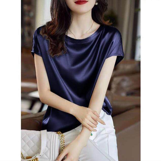 EDQRDQ Women's Short Sleeve Satin Blouse Casual Loose Silk Tops Round Neck Shirt