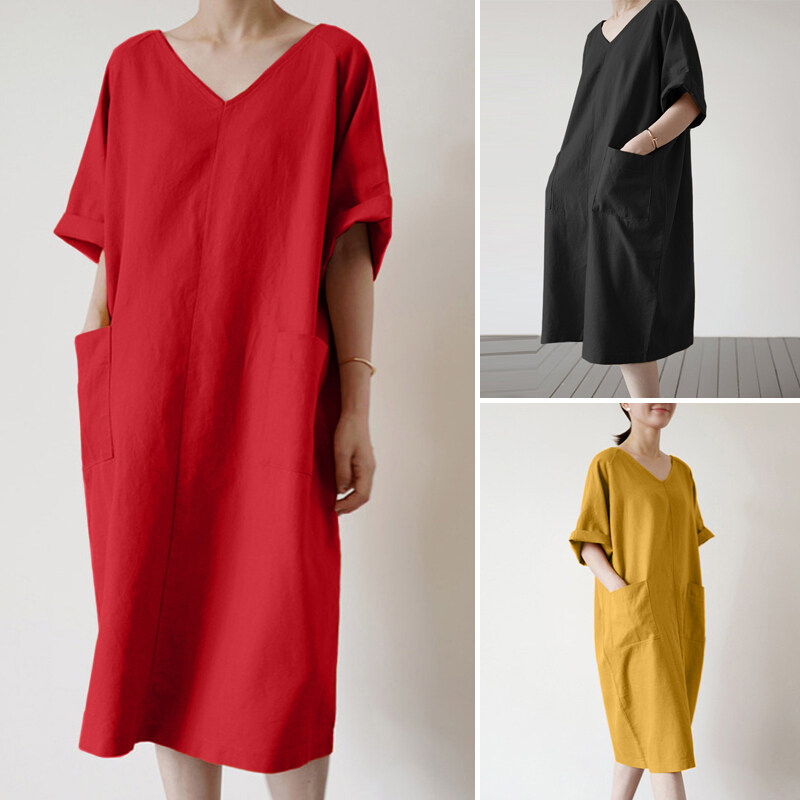 Item Type:DressMaterial:Cotton Colors:Red,Yellow,BlackSize:S,M,L,XL,2XL,3XL,4XL,5XLPackage include:1 DressCutting:LooseLength:Mid-Calf LengthCollar:V-NeckSleeve Style:RaglanSleeve Length:Short SleeveFeatures:Side PocketsPattern:SolidThickness:StandardStyle:Casual,Street Fashion,Preppy styleSeason:Spring,Summer,AutumnOccasion:Daily,Party,Office,Holiday,Casual,Wedding,Travel