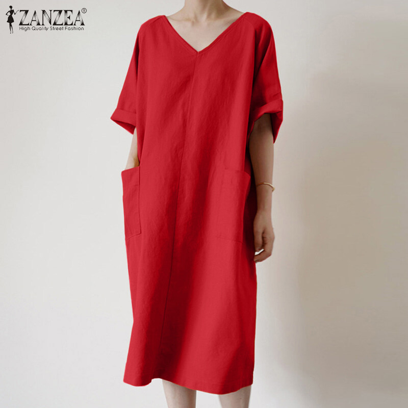 ZANZEA Women Summer Short Sleeve V Neck Dress Oversized Solid Color T Shirt Midi Dresses