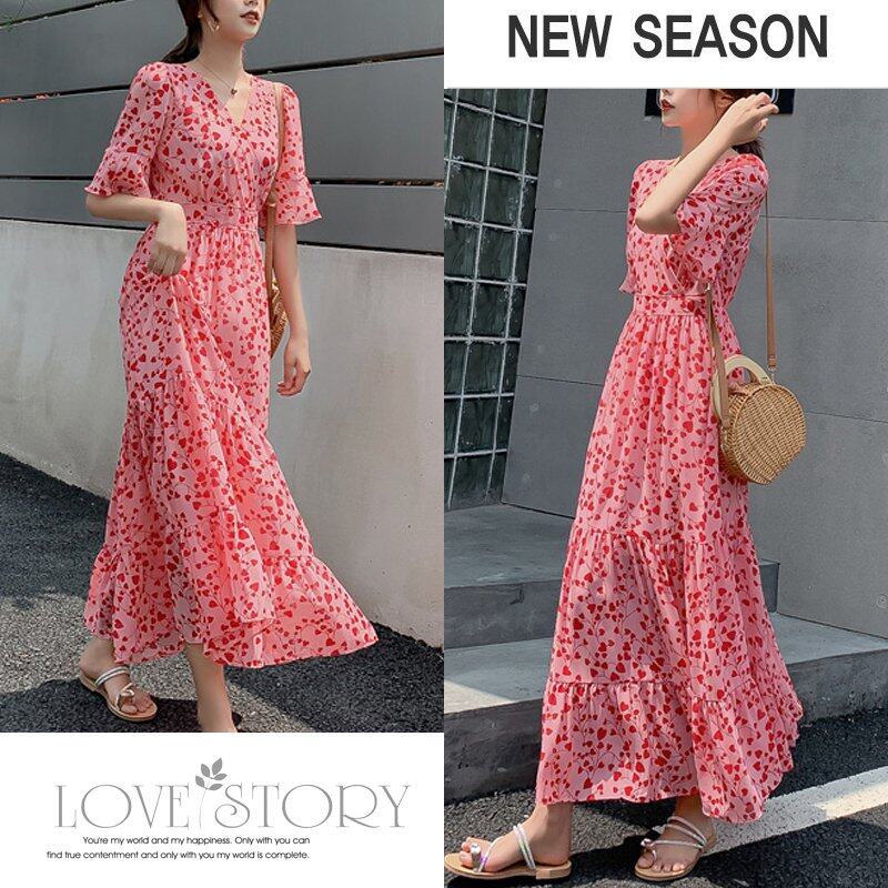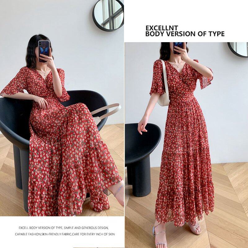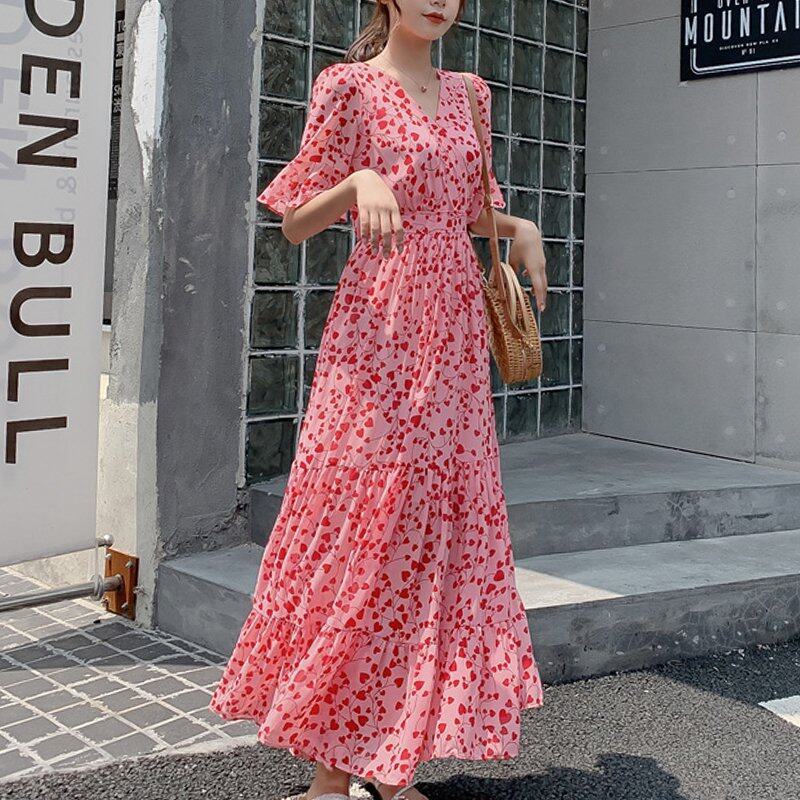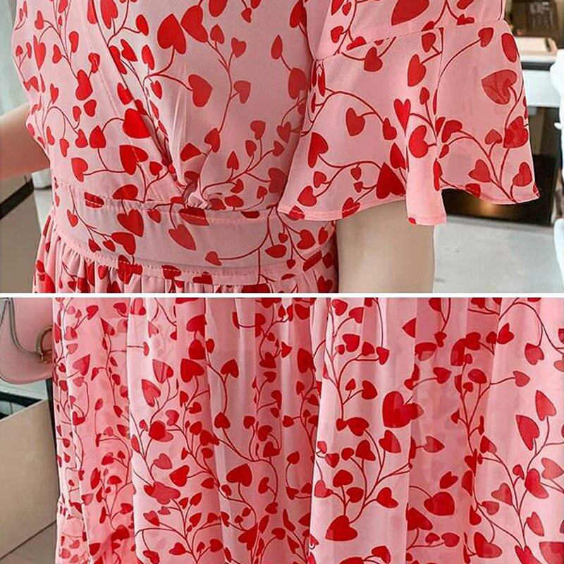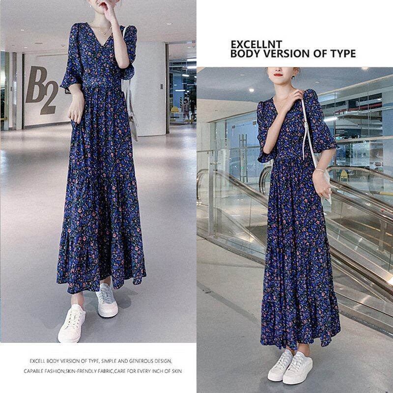 INWPLLR Elegant Fashion Dress Women Puff Sleeve Dress Casual Retro Short Sleeve Floral Printing Dresses Summer Korean Long Dress Female