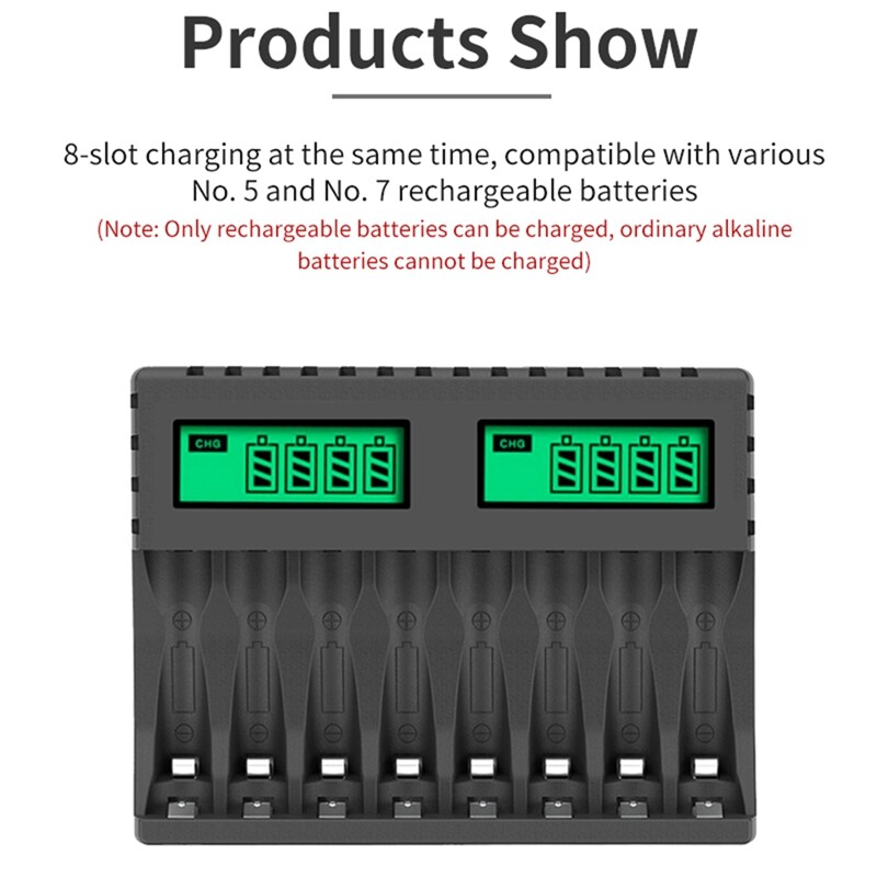 1.This charger can charge 1-8pcs AA/AAA Ni-MH/Ni-Cd rechargeable batteries, LCD displays.