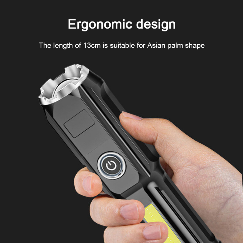 Basic ParametersMaterial: ABS plastic material Battery: Built-in rechargeable battery(Include) Waterproof: life waterproof Charging method: USB charging Weight: about 80g/100g COB Style 4modes:(strong light -low light -flash-COB) Switch: Push the switch Lamp beads: XPE Size: 13*3.5cm Endurance: 4-6H Battery capacity: 1200 mA Gear position: strong light-low light-strobe flash-side light flood light Focusing: telescopic focusing Features: telescopic zoom, battery indicator Package:1pc Flashlight+USB Cable