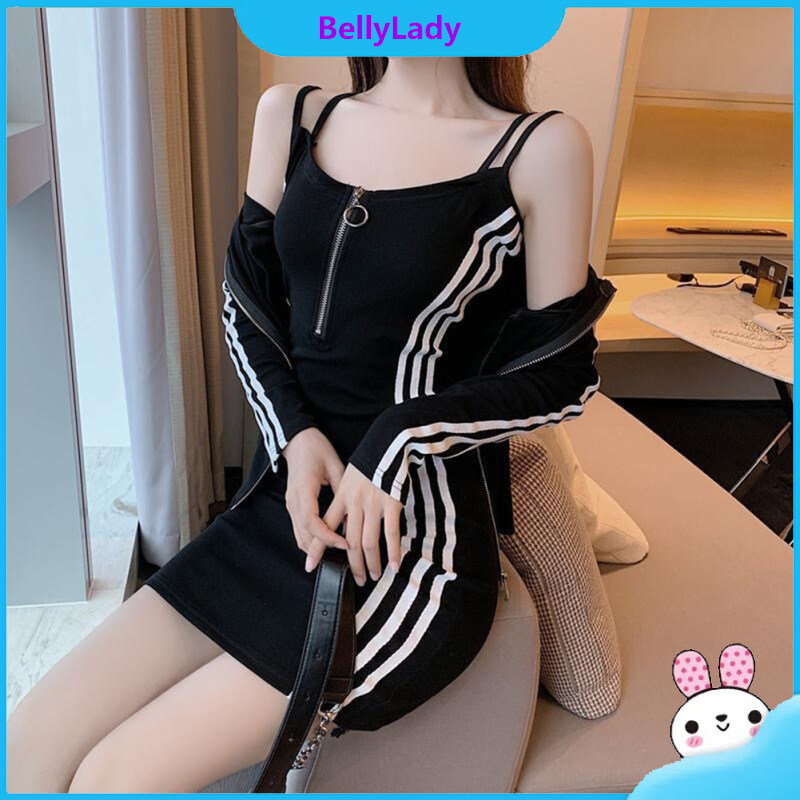 2pcs/set Women Fashion Slip Dress+short Coat Striped Front Zipper Double-shoulder Strap Dress Set