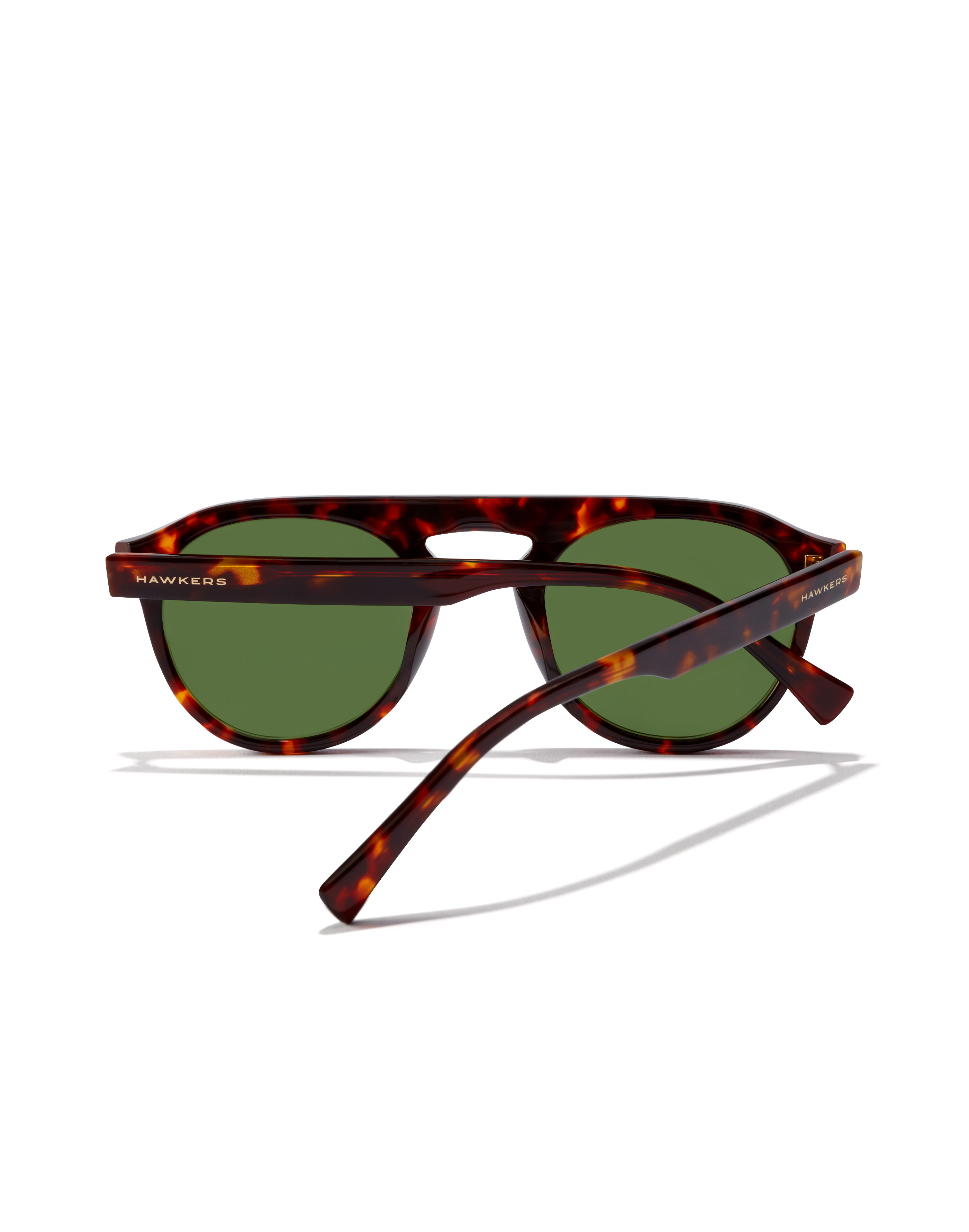 The unconventional flat browline and truncated keyhole bridge of this model belie the simplicity of the overall design at first glance. Rounded bottle green lenses perfectly complement the shiny brown havana acetate frame.