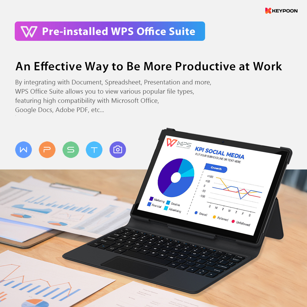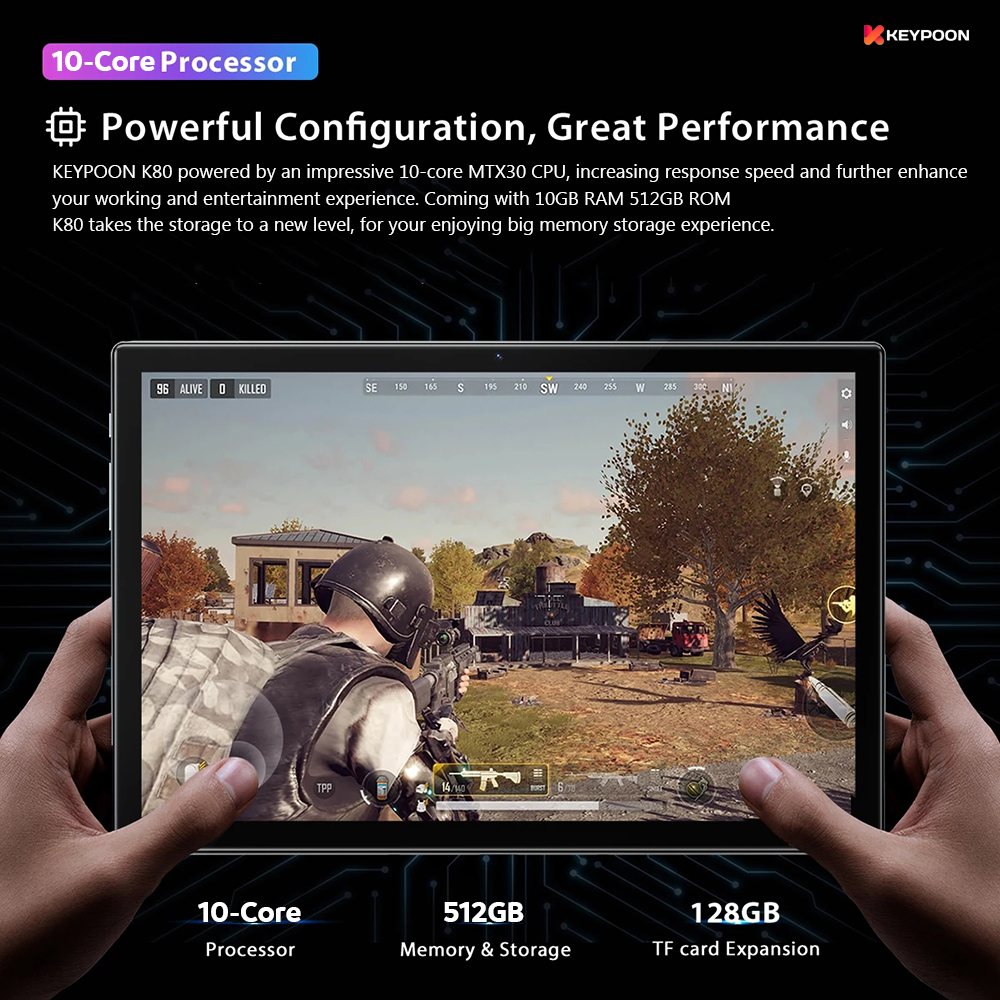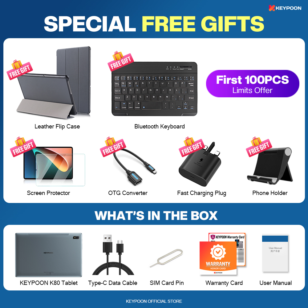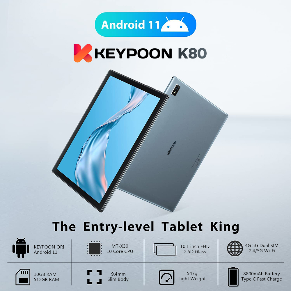 BRAND PROMOTION: 【Buy 256GB Ship 512GB】- Customer just need to order 8GB+256GB variant, then seller will auto ship 10GB+512GB without paying price difference. Limited Quantity Offer 100pcs for sales ONLY!!! WARRANTY: 【1 Year International Warranty】- Comes with KEYPOON Official warranty card. We support 1 year free item warranty, in case the item getting any issue without non-aritificial damages, we can repair and even give 1to1 exchange new item. PRODUCT FEATURE: 【SUPERIOR WATCHING EXPERIENCE】KEYPOON K80 Tablet is powered by 10-Core Processor. 2022 upgraded Android 11 tablet provides + 40% faster processing speed than regular Quad-Core. 10.1-inch Tablet screen size with 1920x1200 resolution support, perfect for home entertainment and office. DUAL-BAND WI-FI】The 2022 KEYPOON K80 Built-in Dual-band wifi module, Support 2.4/5Ghz wifi, the faster wifi you get, the more stable wifi for your smoother watching movie experience. 【DUAL-SIM】The 2022 KEYPOON K80 Tablet support dual SIM feature, support 3G/4G/5G netowrk, and also support phone call feature. All-in-One Tablet that make your life experience be more easier and convenient. 【BIGGER THAN BIGGER】The tablet has 8GB RAM, 256GB/512GB internal storage. The GMS Certified latest Android Tablet, with basic Google apps already on and without bloatware. Get rid of unexpected ads and download apps from Google Play, such as SKYGO, NetFlix, YouTube and more. 【LONG LASTING BATTERY】Equipped with a long-lasting and environmentally compliant 8800 mAh battery, this 10-inch tablet will effortlessly provide you with up to 8 hours of support for reading, browsing, watching movies and playing games. The long-lasting battery life and lightweight design allow you to enjoy your tablet anywhere, anytime. 【DUAL CAMERAS AND SPEAKERS】With front 5 MP & Rear 13 MP dual cameras, which would bring your excellent photos and clear video chats. Dual speakers are designed to provide high-quality and powerful sound for your favorite music, games and videos. SPECIFICATIONS: Model: KEYPOON K80 (2022) CPU: X30 10-Core System: Android 11 (System Upgradable) Screen Size: 10.1 Inches IPS Screen Screen Resolution: 1920 * 1200 WiFi: Dual Band 2.4G/5Ghz WiFi Bluetooth: BT 4.0 Battery: 8800mAh Li-on Battery Camera: Front 5MP + Rear 13MP Speaker: Dual Stereo Speaker RAM: 6GB/8GB/10GB ROM: 128GB/256GB/512GB Cellular: 3G/4G/5G DUAL SIM Charging Port: Type C WHAT'S IN THE BOX: 1 * Tablet PC 1 * User Manual 1 * Type C Cable 1 * SIM Card Pin 1 * Official Warranty Card SPECIAL FREE FITS: 1 * Leather Flip Case (Limited Gifts) 1 * Bluetooth Keyboard (Limited Gifts) 1 * Tempered Glass Screen Protector (Limited Gifts) 1 * OTG Converter (Limited Gifts)
