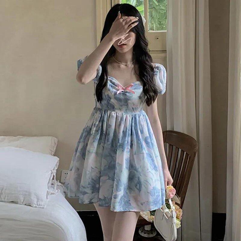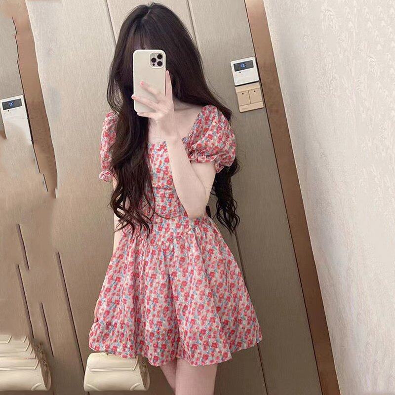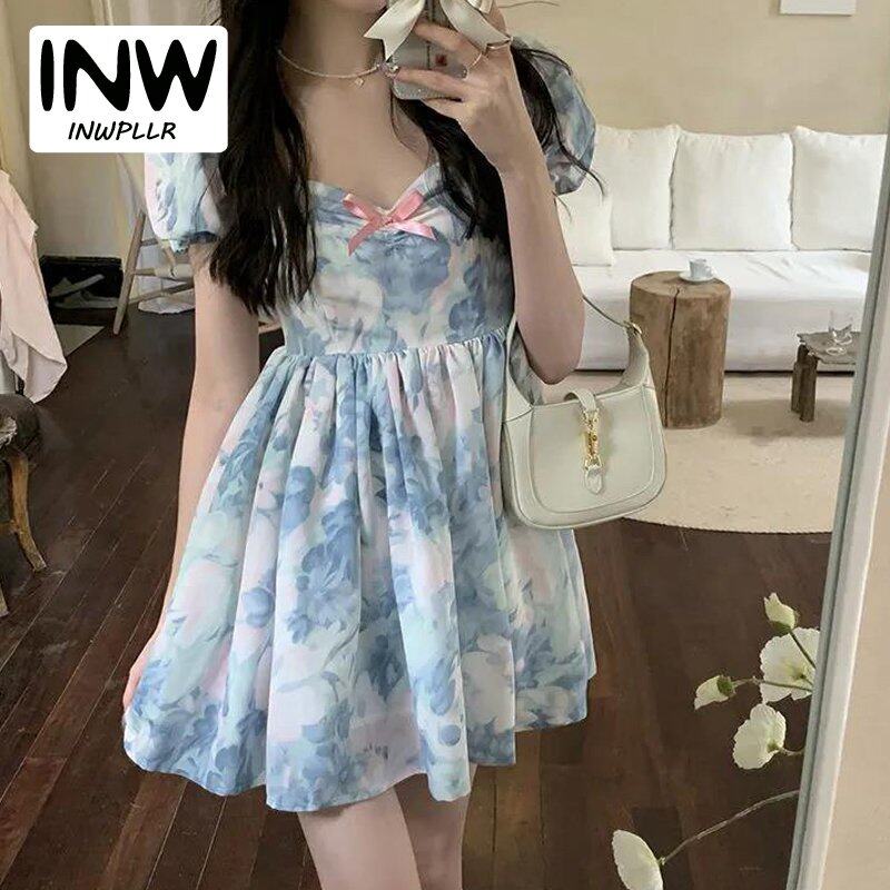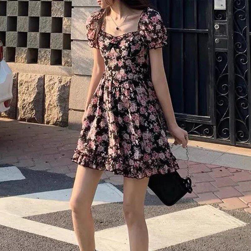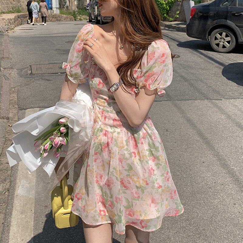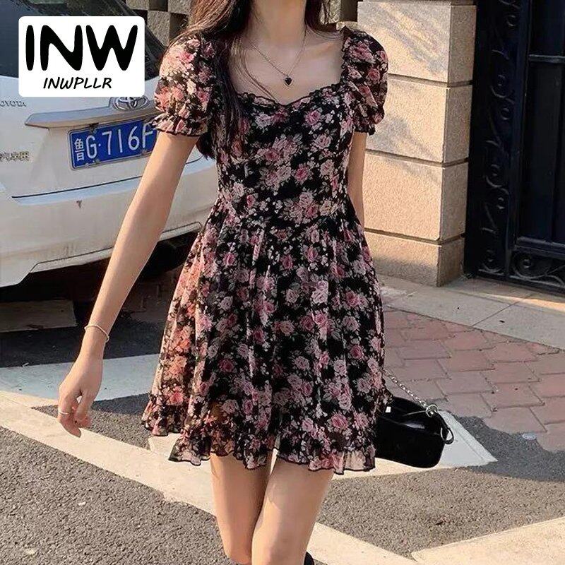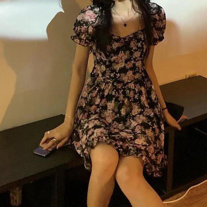 INWPLLR Korean Version Floral Dresses Chic Retro Puff Sleeve Female Dress Elastic Slim Mini Dresses Women