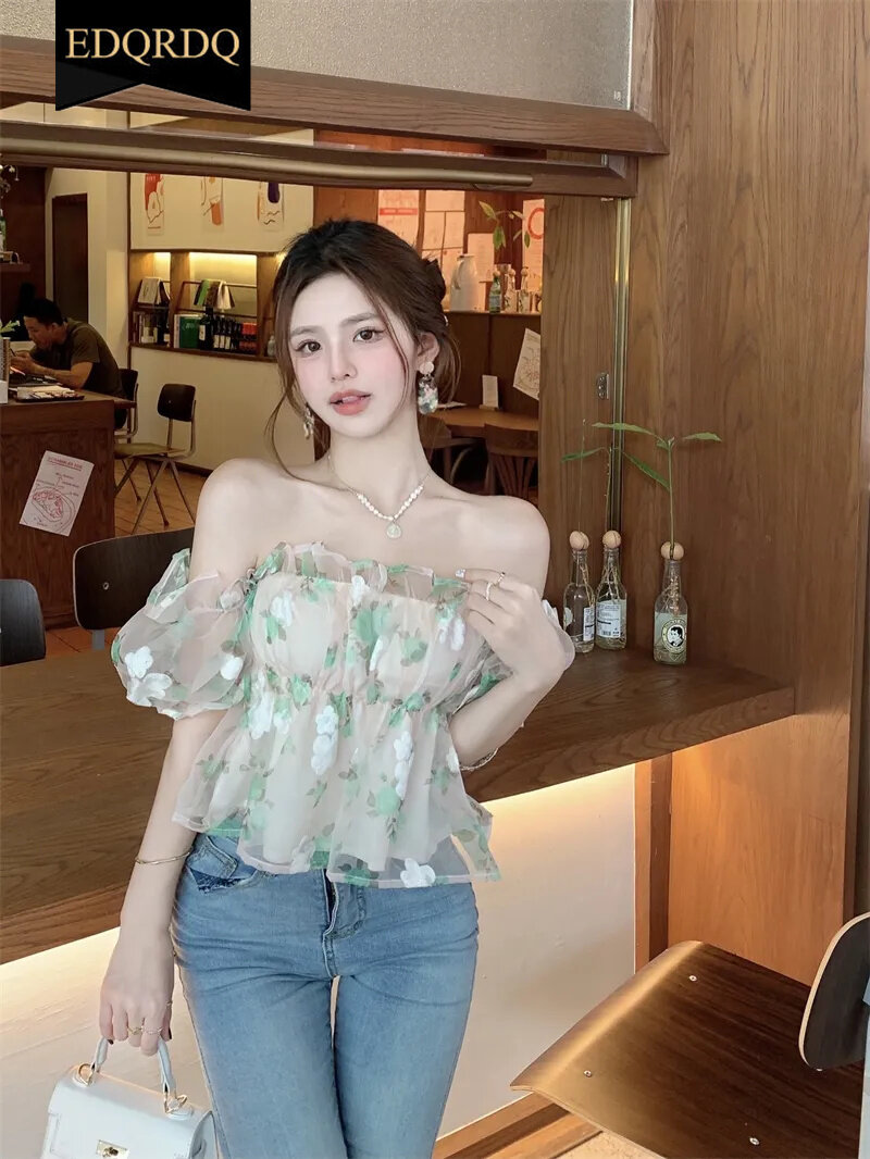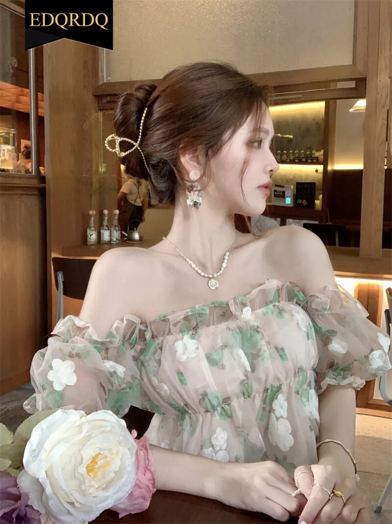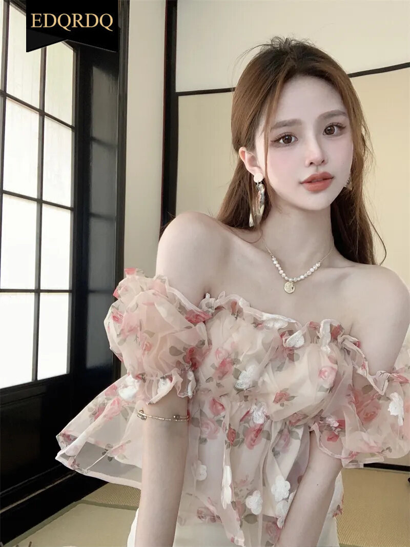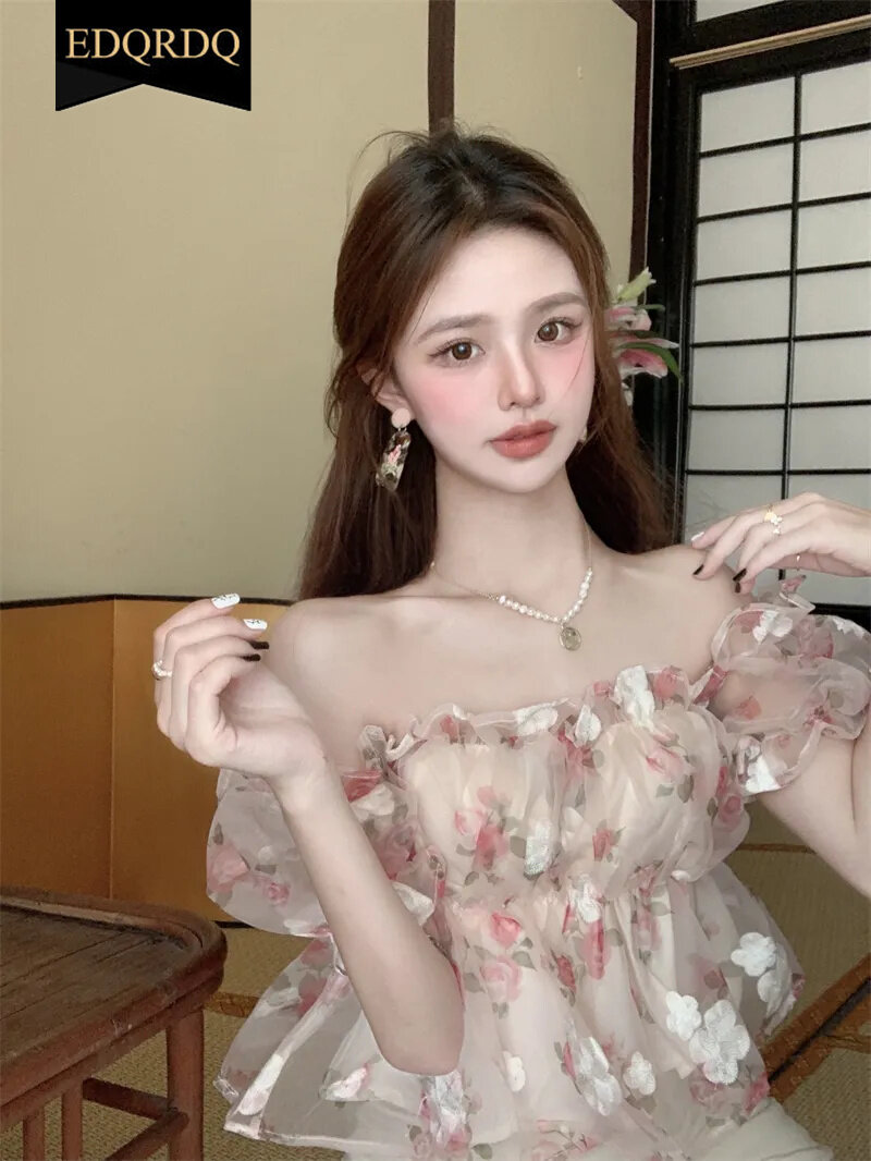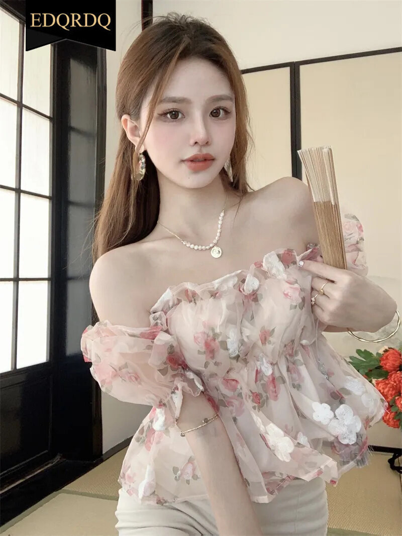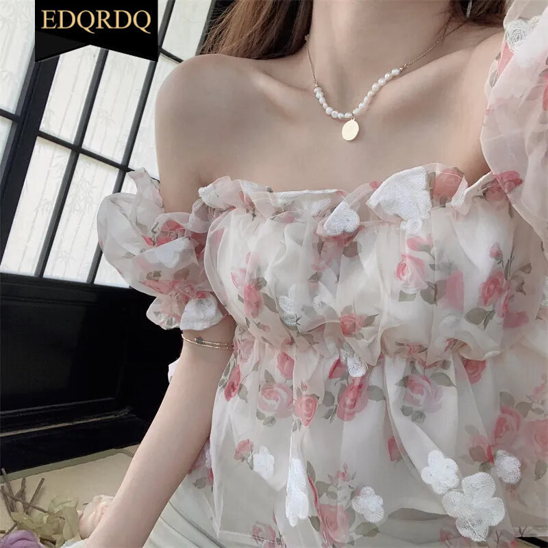 EDQRDQ Off Shoulder Floral Blouses Chiffon Mesh Puff Sleeve Sexy Shirts Tops