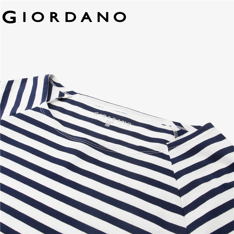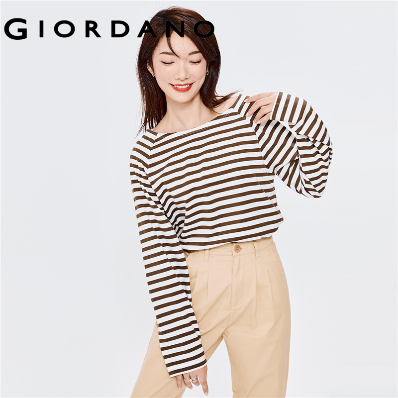 GIORDANO Women T-Shirts Contrast Color Stripe 100% Cotton Casual T-Shirts Long Raglan Sleeve Square Neck Comfy T-Shirts 13322770