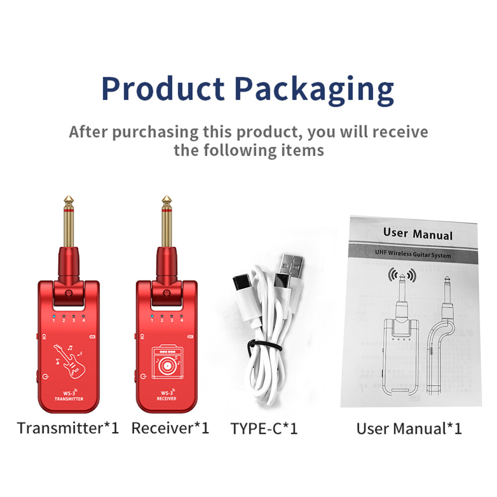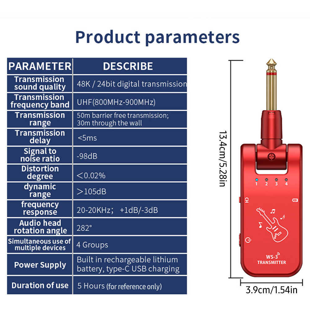 wireless audio system designed for electric musical instruments. The transmission frequency band is 800MHz-900MHz, the transmission range is 50m barrier-free and 30m through the wall. With ultra low delay, original sound quality transmission, strong anti-interference, 282-degree rotation 6.35mm audio interface, built-in rechargeable