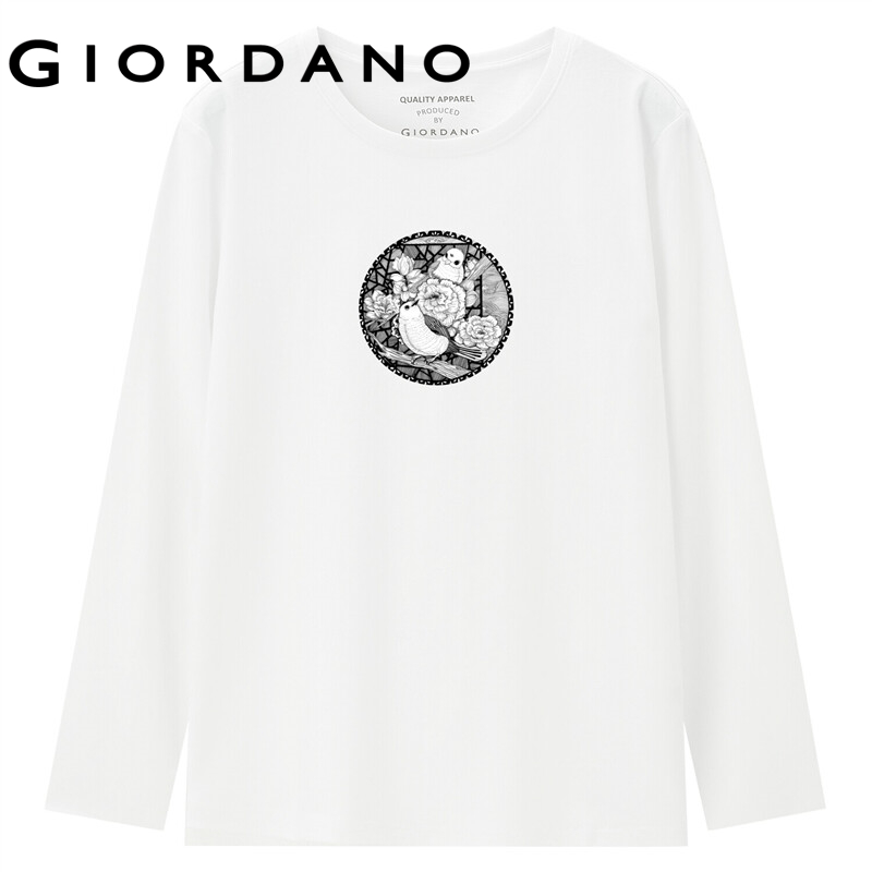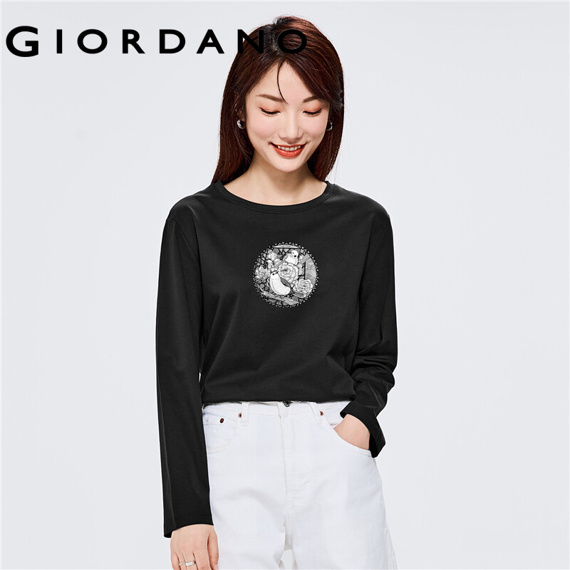 GIORDANO Women San Mei Series T-Shirts Quality 100% Cotton Simple Tee Crewneck Print Long Sleeve Comfy Casual Tshirts 99392198