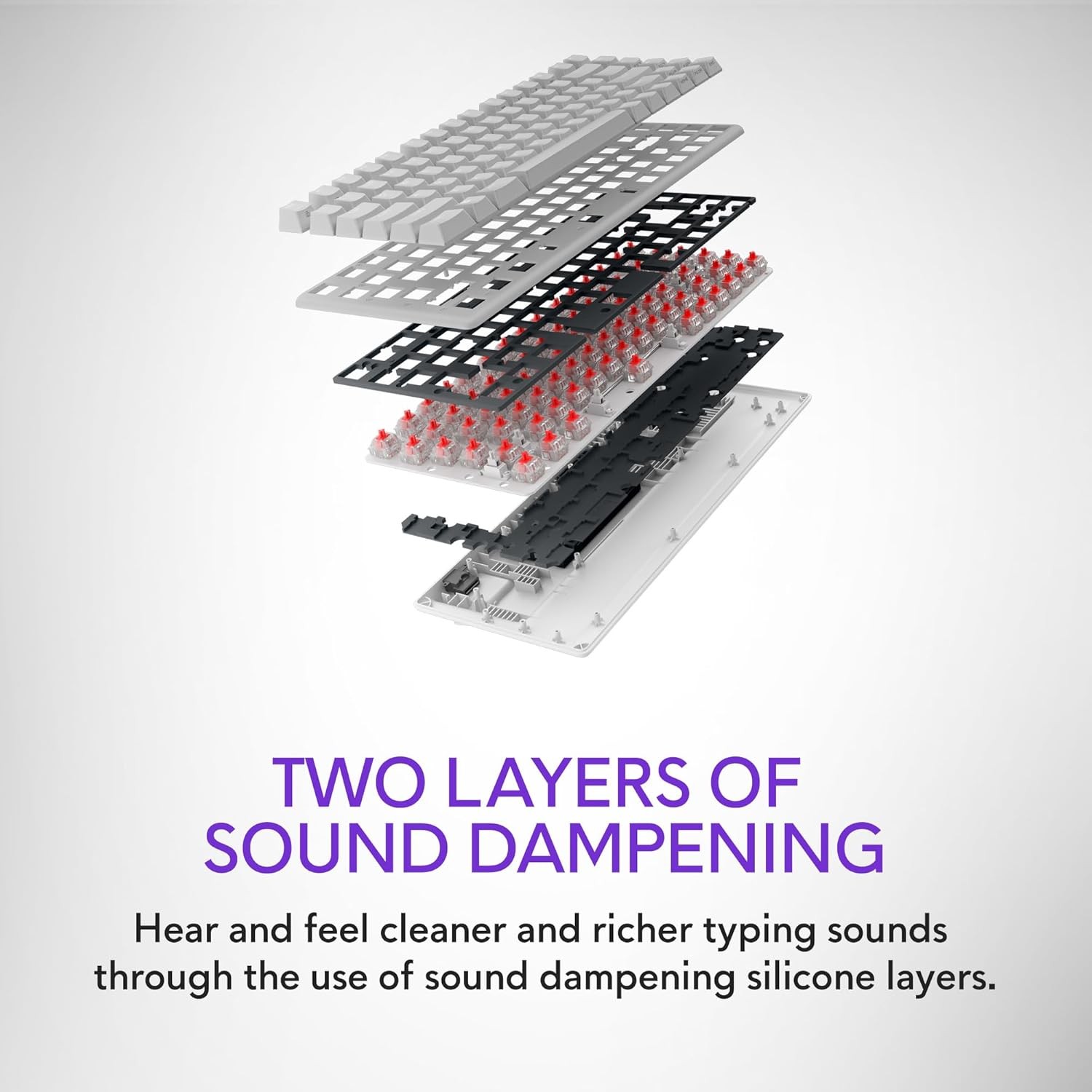 Two layers of sound dampening: Hear and feel cleaner and richer typing sounds through the use of sound dampening silicone layers.