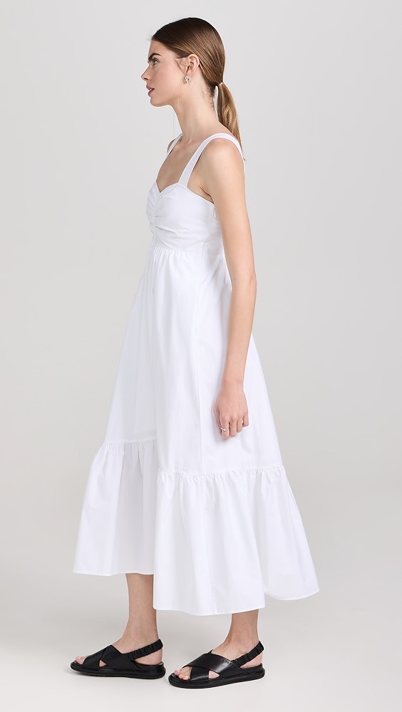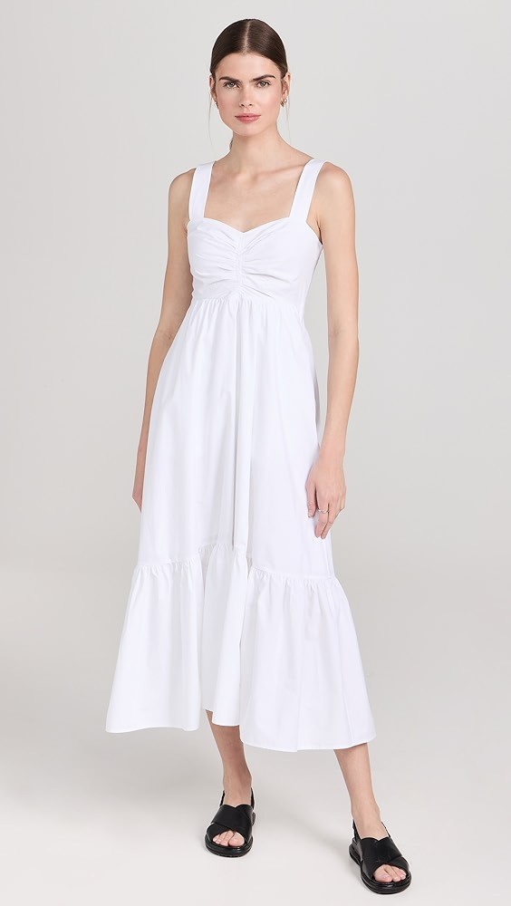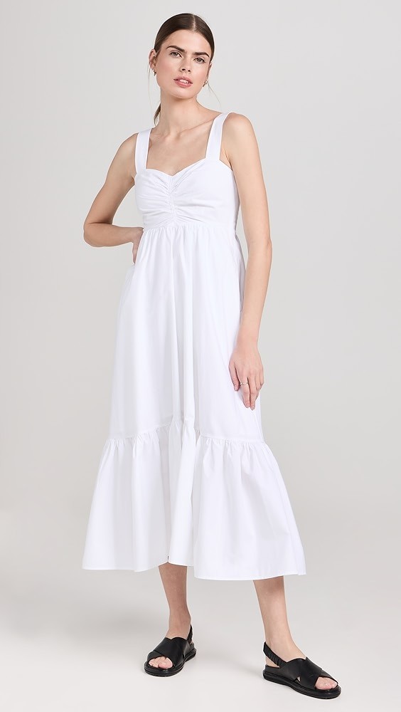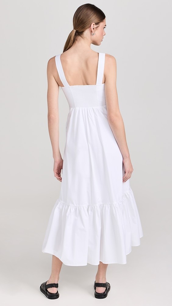 Designed with an A-line silhouette and midi length. Poplin fabric has a smooth, cool hand. Fashion tape may be used to secure the shoulder straps.