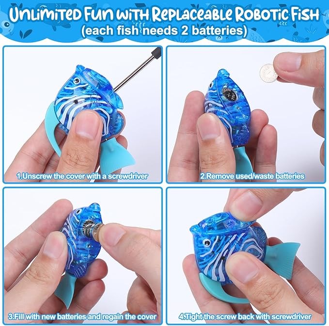 • Package: Including a small cat pool 11.8*4.5in, 6pcs rubber fish built-in squeaker and 2pcs robotic fish with led light, comes with 4 extra battery and a screwdriver for manual replacing