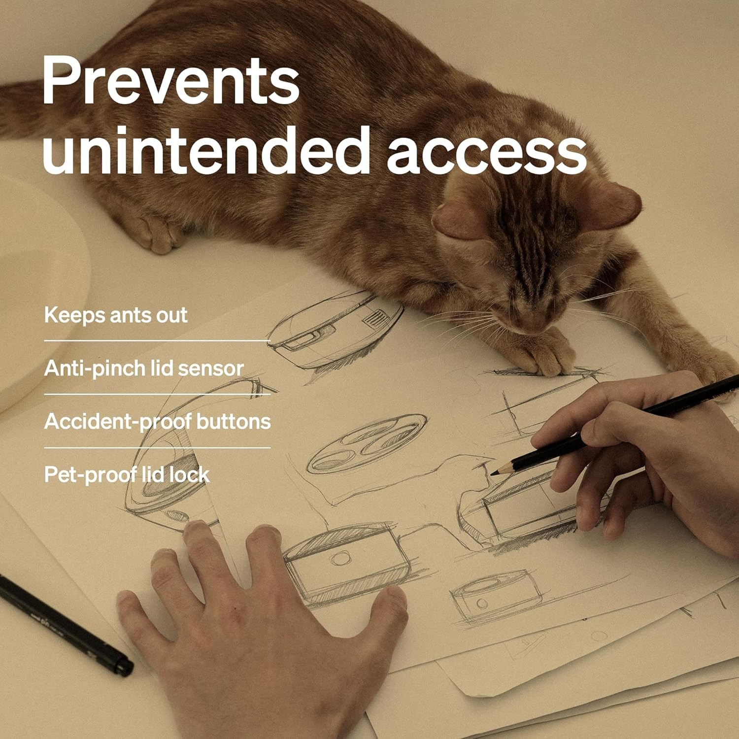 • Engineered for Safety: The refrigerated wet food cat feeder comes with an anti-pinch lid sensor, allowing the lid to stay open when your pet is eating or close by. If a pet is detected while the lid is closing, the lid will instantly stop and retract. The extra-wide feeding trays can hold up to three large portions (maximum of 7.4 oz per portion) of wet food with gravy while preventing whisker fatigue. Furthermore, the unique PawShield design safely keeps wet food in and keeps prying paws out