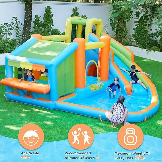 • Well-rounded Private Water Park For Kids: This 8-in-1 water bounce house ensures you and your kids hours of fun in the backyard. It features a large pool area, a slide, a water cannon, a climbing wall with footholds, a bouncer, a basketball hoop, a tunnel, and a cute market stand for pretend play. Suitable for 4 kids aged 3 to 10 (with 99 lb maximum weight for each kid)